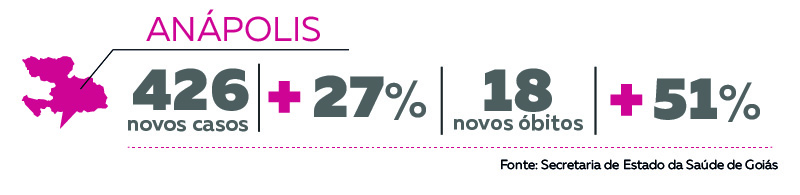 Em Anápolis foram confirmados 336 novos casos, o que representa um aumento de 27,2%. Na semana anterior, o crescimento foi de 14,1%. O número de mortes na cidade saiu de 35 para 53, um acréscimo de 51,4%.