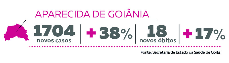 Entre as três maiores cidades do estado, Aparecida de Goiânia registrou o maior aumento. O número de casos de coronavírus saiu de 4.437 para 6.141, um crescimento de 38,4% no período. O percentual está acima da média estadual, mas foi menor do que o notado no período anterior, quando o acréscimo foi de 23,7%. Ocorreram ainda 18 novos óbitos, o que representa um aumento de 17,5%. O total agora é de 121 vítimas fatais na cidade.