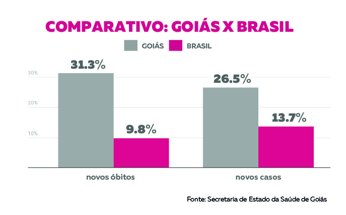 Os dados também mostram que tanto o número de casos quanto de óbitos continua crescendo acima da média nacional. Em todo o país, o número de casos confirmados de coronavírus subiu 13,7% no período, chegando a 2.287.475 infectados, de acordo com o Ministério da Saúde (MS). Já o número de vítimas fatais aumentou 9,8% e chegou a 84.082. Entretanto, a taxa de letalidade no estado de Goiás (2,5%) é menor do que a média brasileira (3,7%).