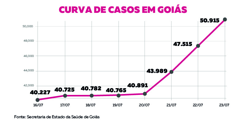 O estado de Goiás registrou 10.688 casos de coronavírus em uma semana, de acordo com os dados fornecidos pela Secretaria de Estado de Saúde (SES)*. Nesta quinta-feira (23), foram registradas 50.915 confirmações, contra 40.227 do dia 16 de julho. O aumento no período foi de 26,5%.