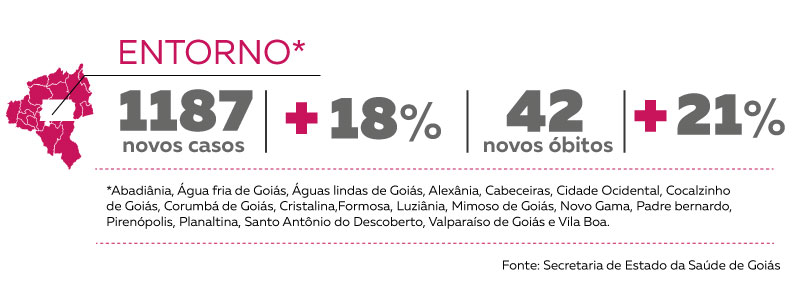A região do Entorno de Brasília apresentou um percentual de crescimento abaixo da média estadual. Em uma semana, o número de casos de coronavírus saiu de 6.592 para 7.779, o que representa um aumento de 18%. O percentual apurado é menor do que o registrado na semana anterior, de 20,9%. Foram confirmadas também 42 mortes na semana, um crescimento de 21,5%.