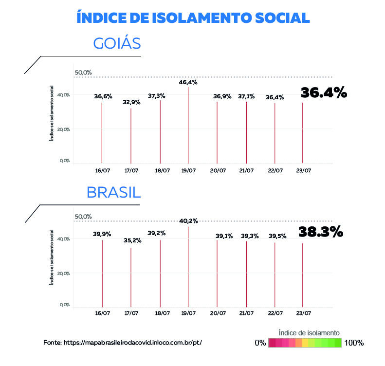 O índice de isolamento social em Goiás diminuiu pouco nesta semana, saindo de 36,7% para 36,4%, de acordo com o monitoramento da empresa de georreferenciamento In Loco. O estado possui o segundo pior índice de isolamento social do país, perdendo apenas para o Tocantins (35,1%). A média nacional é de 38,3% e o recomendado pelas autoridades de saúde é de 70%.