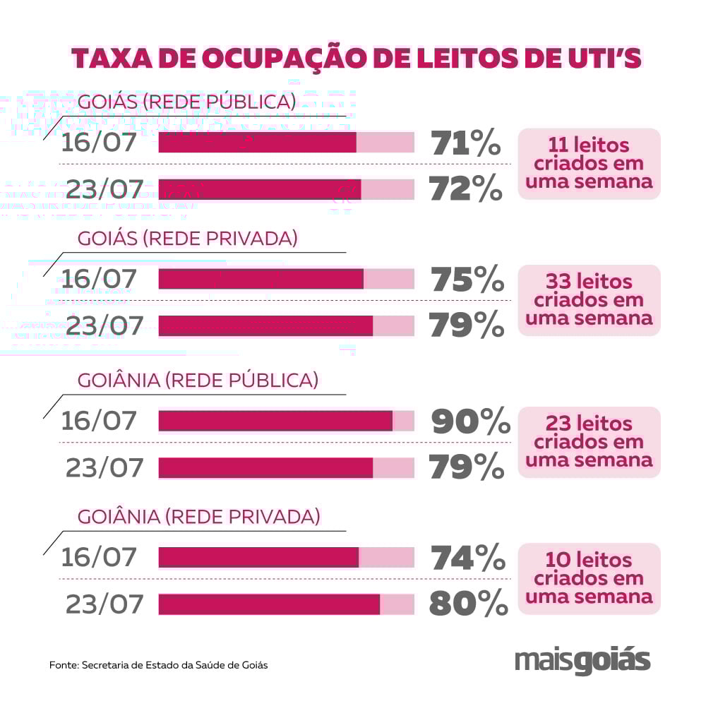 A taxa de ocupação dos leitos em Goiás aumentou, tanto na rede pública quanto na privada. De acordo com dados da SES, no dia 16 de julho o estado de Goiás contava estava com 71,46% dos leitos destinados ao tratamento de Covid-19 ocupados. Este percentual subiu para 72,53% nesta quinta (23). Além disso, foram implantados 11 leitos no período, contra 155 da semana anterior.