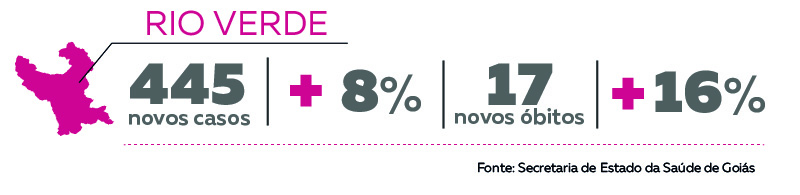O município de Rio Verde, no Sudoeste do estado, tem o segundo maior número de casos confirmados da doença. Até quinta (23), foram 5.779 registros de Covid-19 na cidade. Em uma semana, o crescimento foi de 8,3%. Este percentual foi maior do que o apurado na semana anterior, quando foi registrado um crescimento de 5,9%.