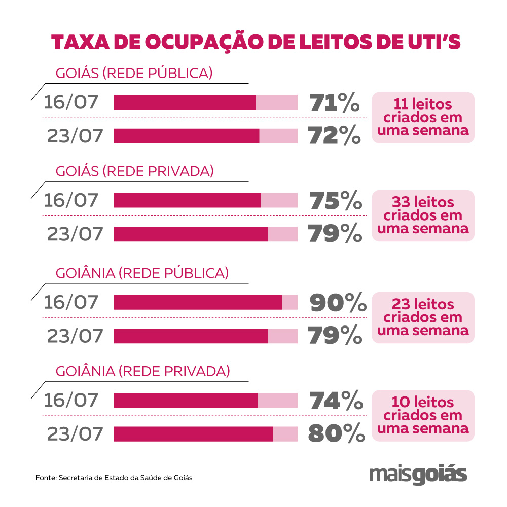 A taxa de ocupação dos leitos em Goiás aumentou, tanto na rede pública quanto na privada. De acordo com dados da SES, no dia 16 de julho o estado de Goiás contava estava com 71,46% dos leitos destinados ao tratamento de Covid-19 ocupados. Este percentual subiu para 72,53% nesta quinta (23). Além disso, foram implantados 11 leitos no período, contra 155 da semana anterior.