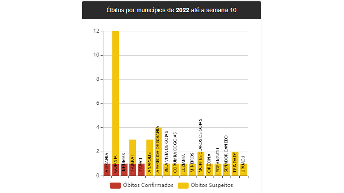 Em todo o ano de 2021, foram 31 mortes. Naquele ano, na décima semana não havia mortes confirmadas e eram seis casos suspeitos. As informações estão no site Indicadores da Saúde, da secretaria de Saúde de Goiás (SES-GO).
