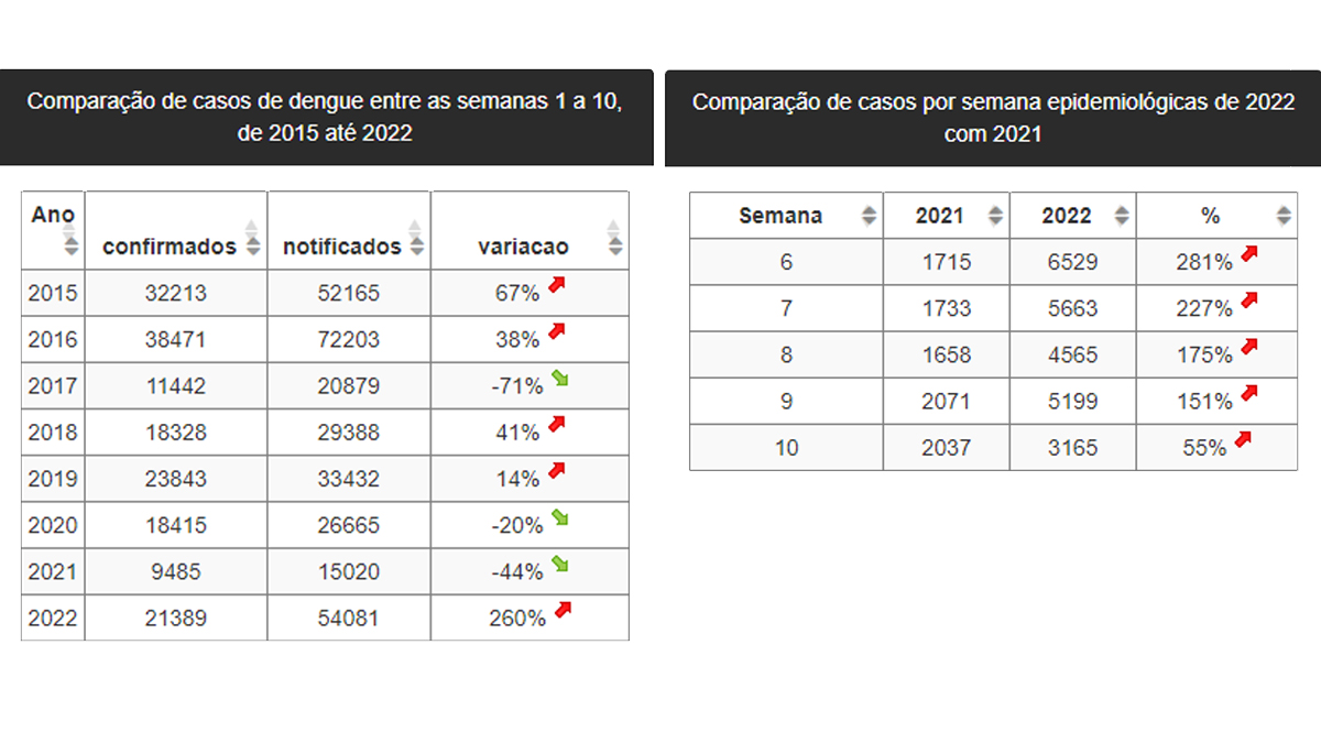 Neste ano, foram 54.081 notificações e 21.389 ocorrências confirmadas. Em 2021, foram 15.020 e 9.485 respectivamente, no mesmo período.
