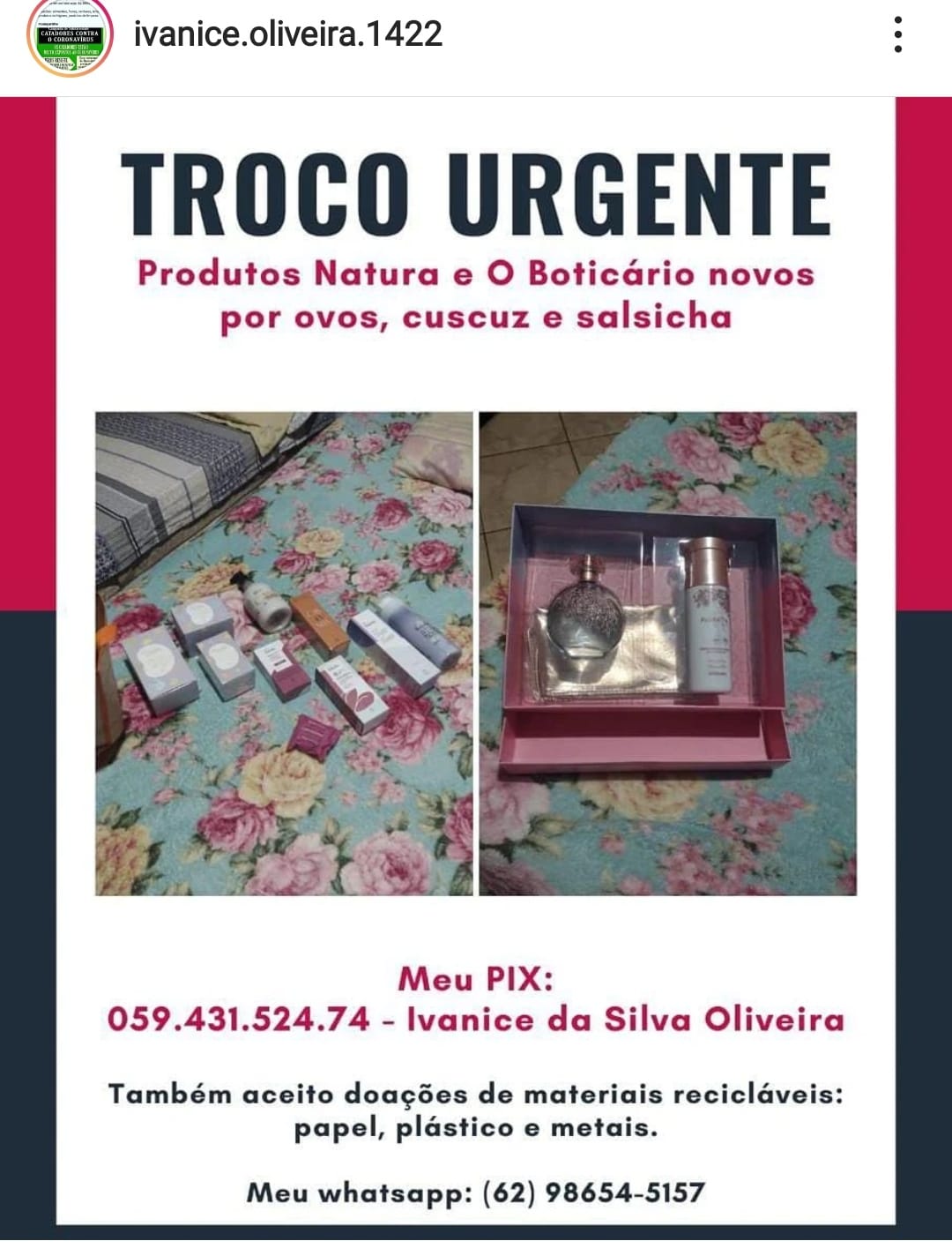 Devido à falta de alimentos em casa, Ivanice publicou no Instagram um pedido de ajuda no qual oferece os produtos em troca de alimentos como cuscuz, ovos e salsicha. “Também aceito doações de materiais recicláveis: papel, plástico e metais”. A postagem acompanha o endereço Pix da catadora para possíveis doações (059.431.524-74), e seu número de telefone.