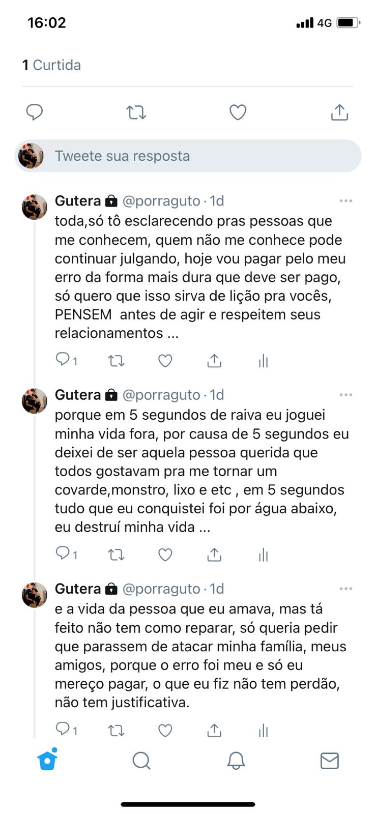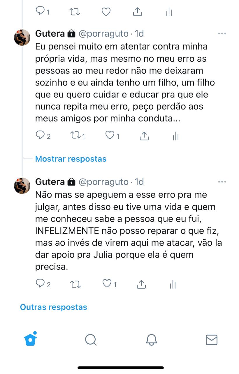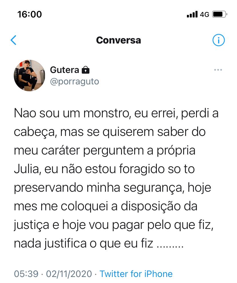 Além disso, ele alegou que está a disposição da Justiça “para pagar o erro que cometi.” O rapaz pontuou que “não tem perdão e nem justificativa” pelo o que fez. Em outro post, ele alega que “não é um mostro” e contou que está em um país vizinho e que não está foragido. Segundo ele, viajou para preservar a sua segurança.