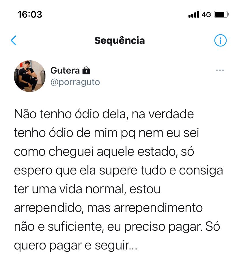Por fim, o goiano afirma que não sente ódio da vítima. “Na verdade, tenho ódio de mim porque nem eu sei como cheguei àquele estado. Só espero que ela supere tudo e consiga ter uma vida normal. Estou arrependido, mas arrependimento não é suficiente, eu preciso pagar. Só quero pagar e seguir…”, disse em publicação.
