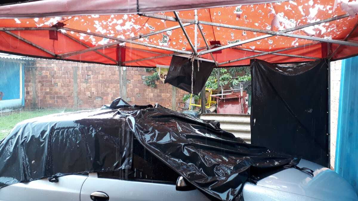 O autônomo revela que tentou cobrir o carro após a tenda que o protegia, antes intacta, ficar destruída pelo granizo. Além da cobertura, ele diz que todas as plantas do seu quintal também ficaram arrasadas. “Era cada pedrona que caía. Eu já tinha visto outras chuvas de granizo, mas não com pedras desse tamanho”, expõe.