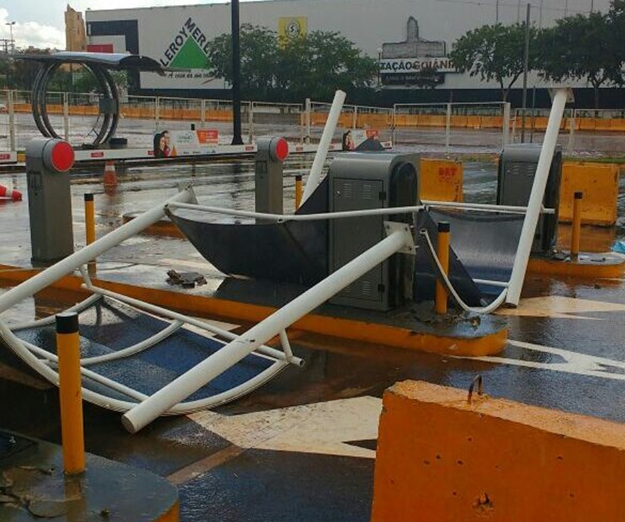 Cancelas de entrada e saída de veículos do estacionamento foram derrubadas pelo vento. (Foto: Leitor/ Mais Goiás)