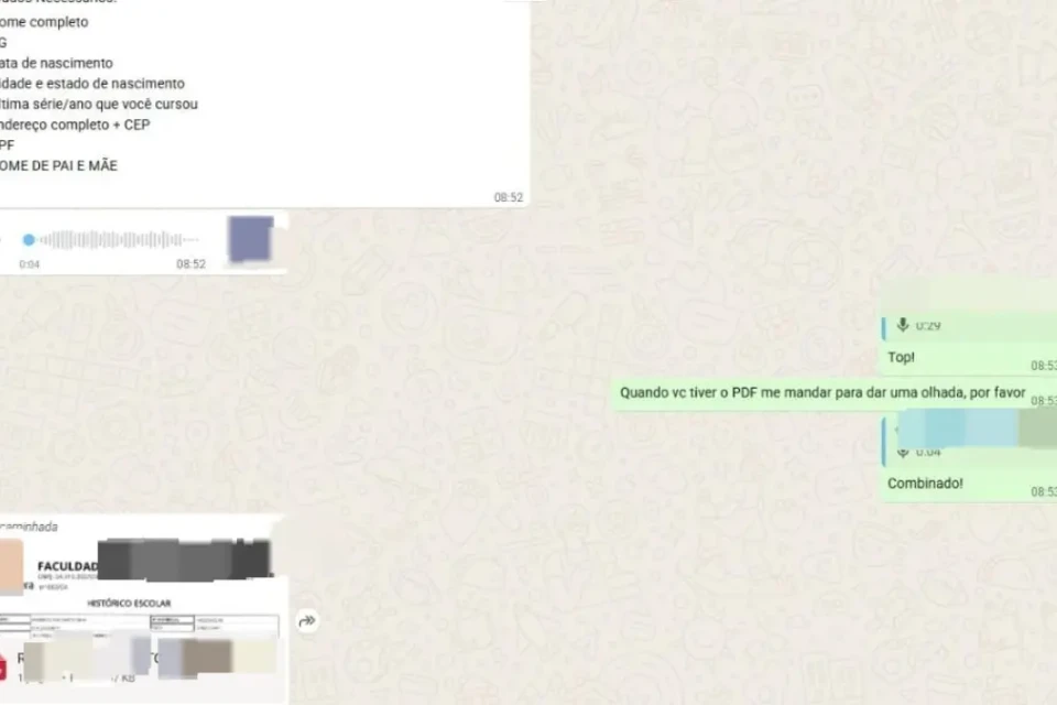 “Não corre não [risco], amigão. Pode ficar tranquilo, tá? A gente tá nessa área aí já tem quase cinco anos. A documentação é toda original, toda registrada. É show de bola, cara. Tudo registrado, documentado. Apaguei aí porque é documentação de outro cliente, tem os dados pessoais”, explica o falsificador ao disponibilizar um diploma supostamente fraudado para ganhar a confiança do repórter.