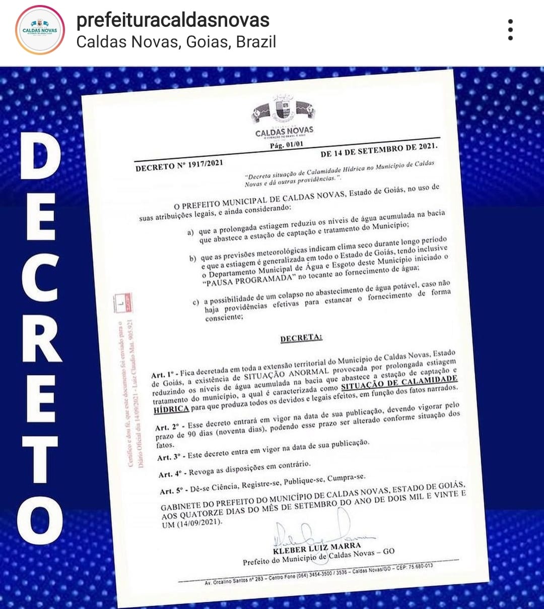 Em comunicado, o diretor-presidente do Departamento Municipal de Águas e Esgotos de Caldas Novas (Demae), Rafael Marra, disse que o sistema de captação de água do município não recebeu investimentos nos últimos 20 anos, e que mais recursos são necessários para solucionar a crise hídrica.