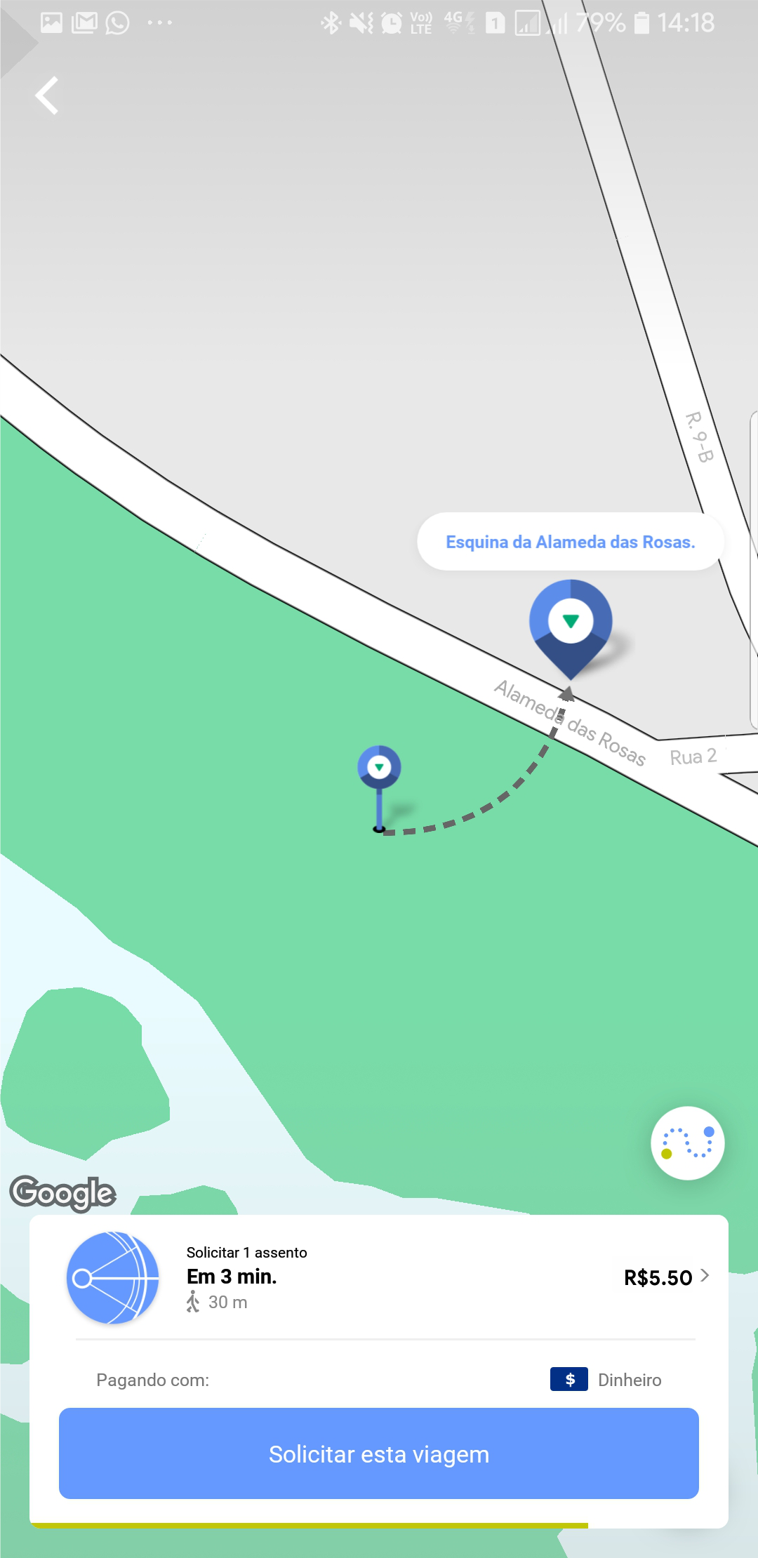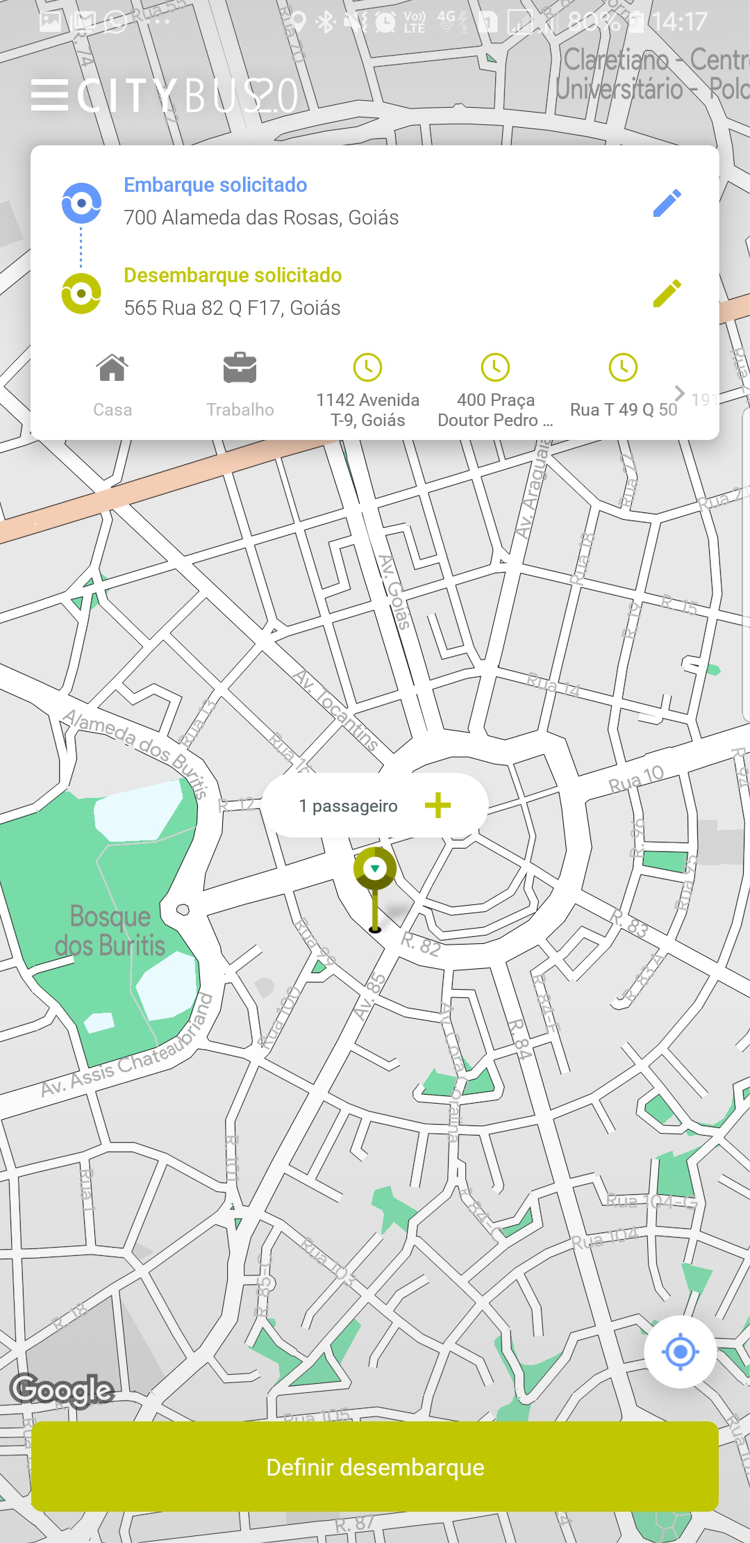 Para fazer a viagem, primeiro é preciso definir o número de passageiros (o Citybus permite fazer viagens em grupo) e o local de embarque e desembarque. Quando tudo isso estiver definido, o app irá indicar o local do ponto virtual e o valor da viagem: