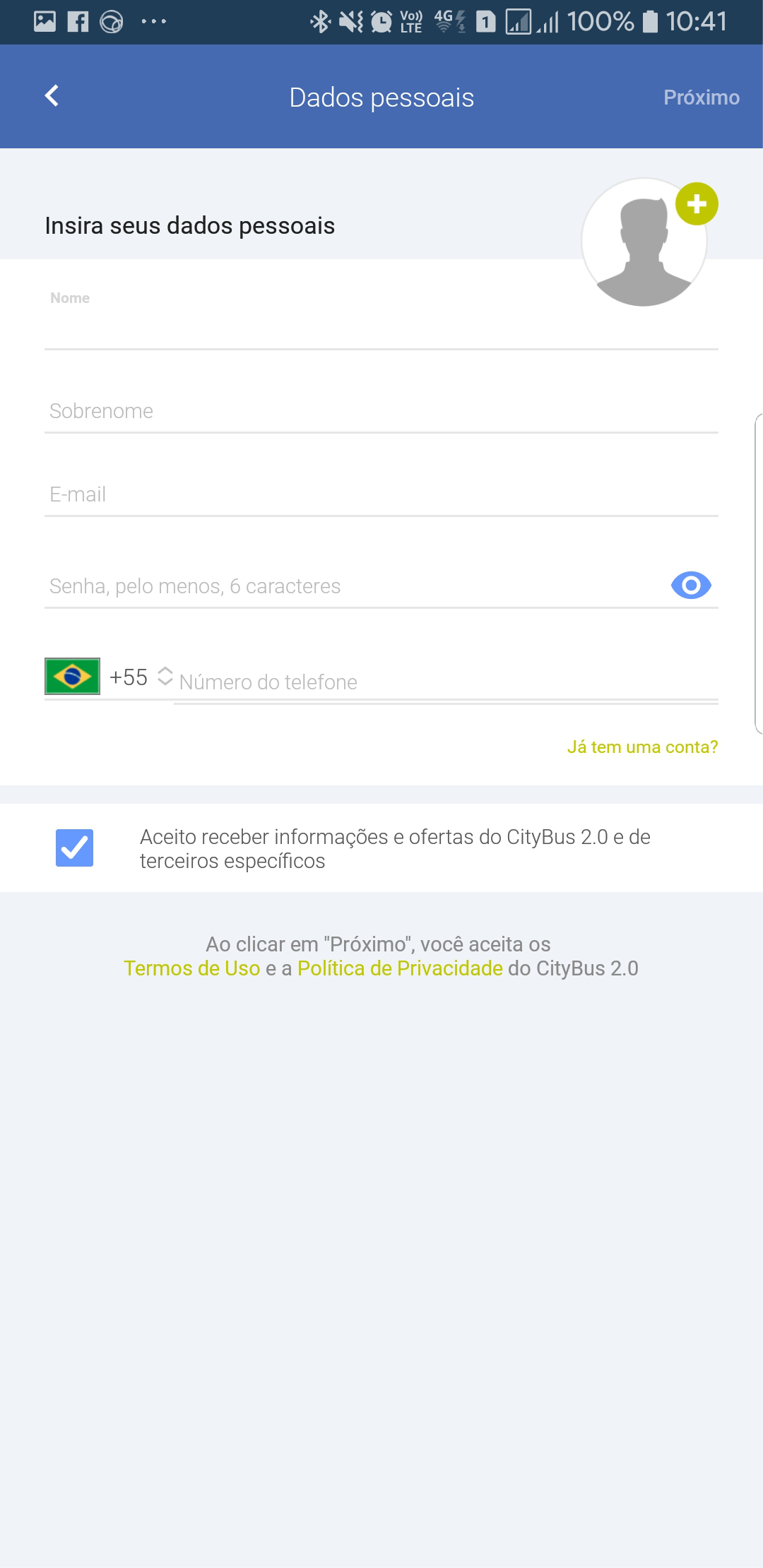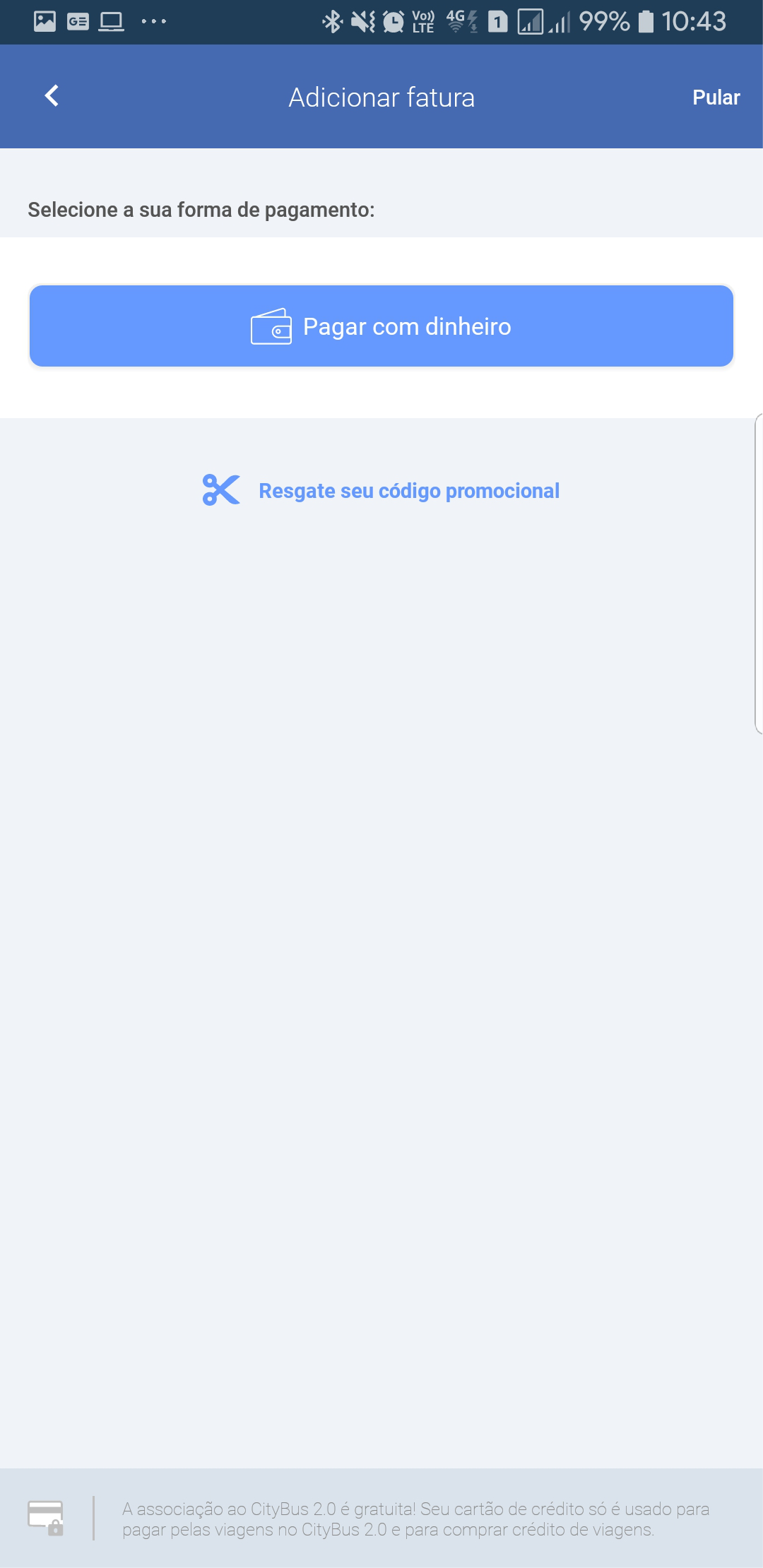 O primeiro passo para utilizar o Citybus 2.0 é baixar o app. Ele está disponível desde domingo (10) para IOS e Android em suas respectivas lojas. Depois será necessário fazer um cadastro, aceitar os termos de uso, e selecionar a forma de pagamento, conforme imagens abaixo: