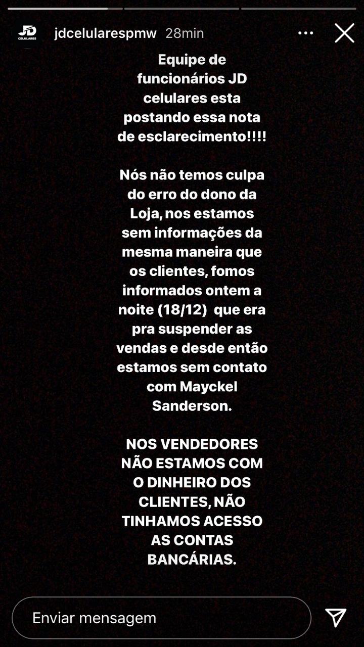 A página da JD Celulares no Instagram continua ativa, com 106 mil seguidores. As postagens, no entanto, estão com os comentários desativados.