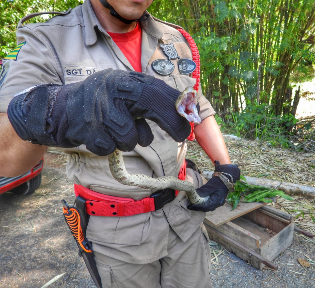Com a orientação de um biólogo da cidade, a cobra foi capturada e solta em uma árvore de reserva ambiental, pois tem hábito arborícola, ou seja, eventualmente desce ao chão.