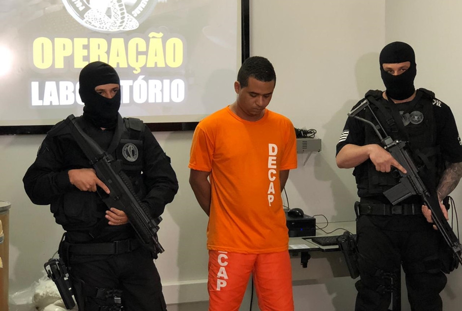 Jeferson Araújo Santos, de 27 anos, que já possui passagens pro roubo, furto, e porte ilegal de armas, foi abordado por agentes da Denarc no momento em que saía para entregar 53 quilos de cocaína pura. Dentro do imóvel onde ele estava morando, no Setor Eli Forte, em Goiânia, os agentes encontraram um revólver calibre 38 e uma pistola calibre 380, 300 munições de fuzil calibre 5.56, 73 quilos de pasta base de cocaína, uma prensa, 300 quilos de insumos, além de outros equipamentos usados no refino de drogas.