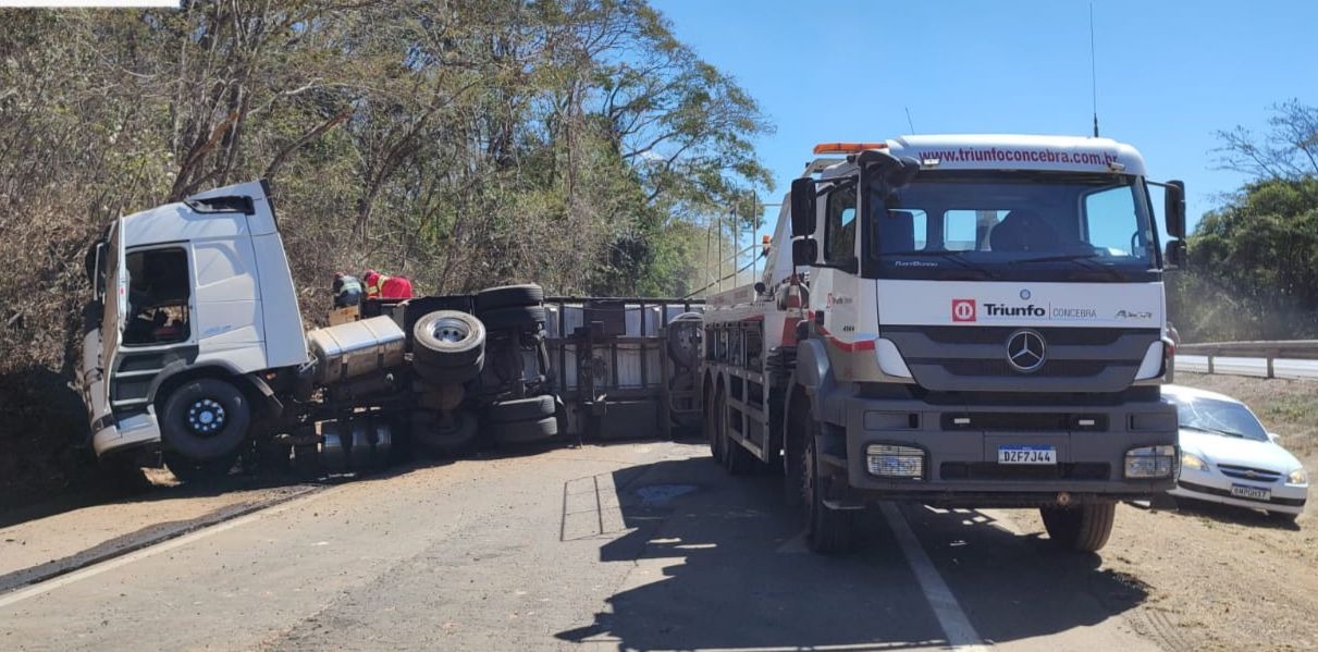 Uma colisão envolvendo um carro e uma carreta que acabou tombando na BR-153 deixou o trânsito parado no km 544, sentido sul, nas proximidades de Hidrolândia, no fim da manhã deste domingo (23/07).