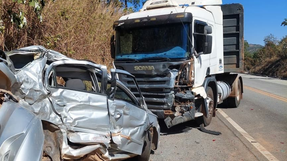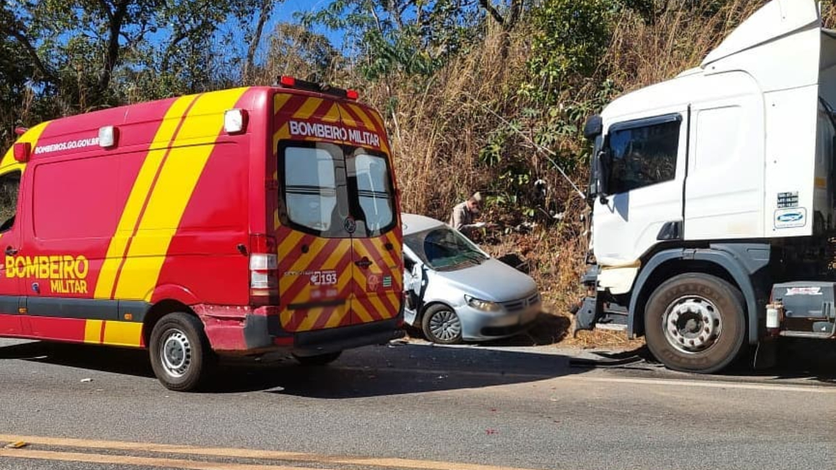 Colisão entre carro e caminhão deixa motorista preso entre às ferragens, na GO-164