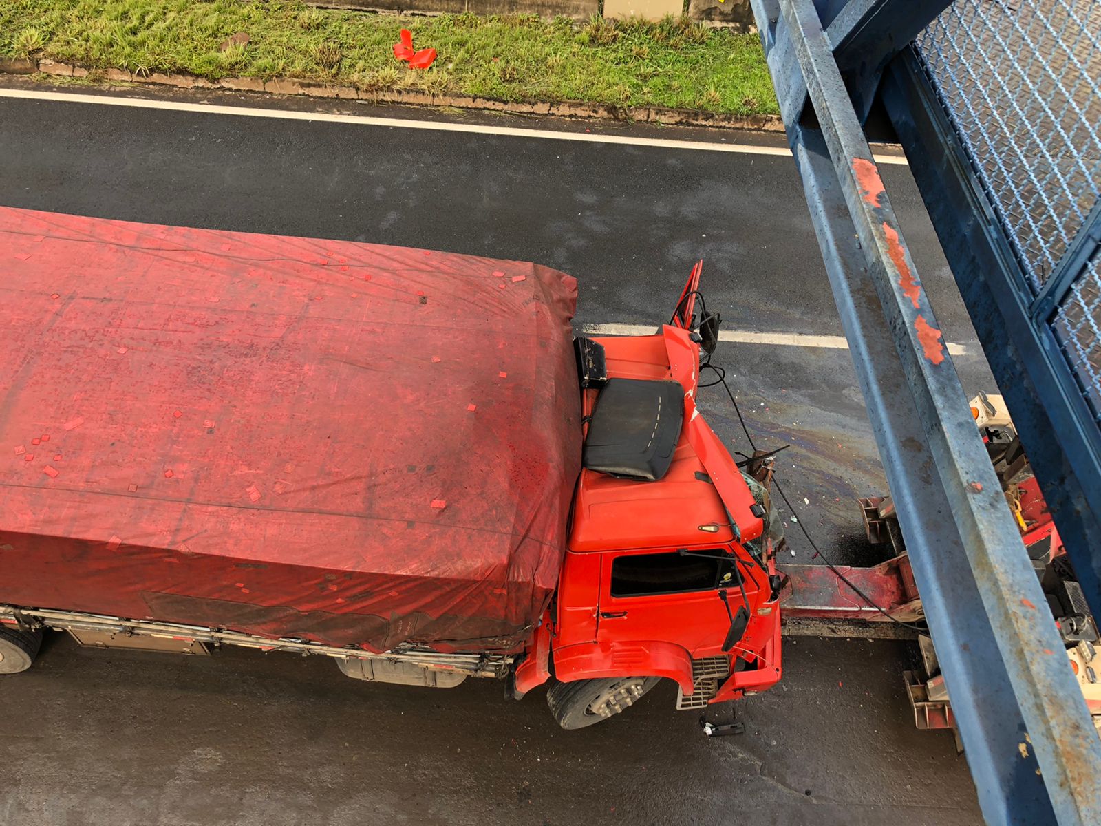 De acordo com a concessionária que administra o trecho da rodovia, Triunfo Concebra, o acidente foi uma colisão traseira envolvendo um caminhão e uma carreta.