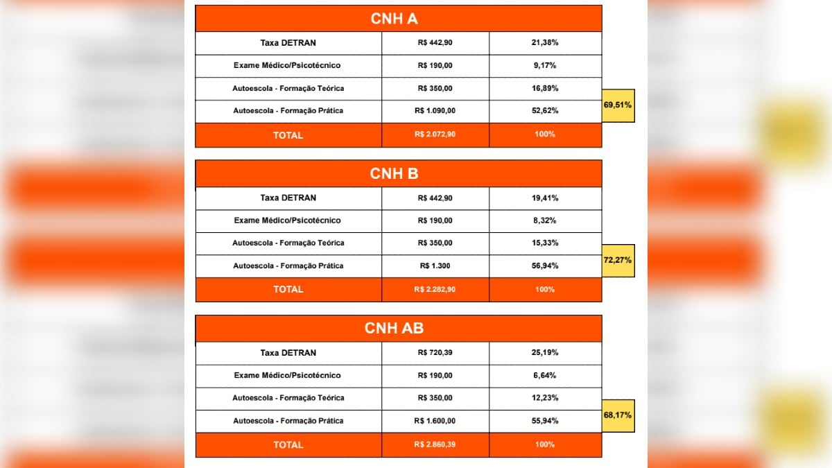 Ao detalhar, conforme o Detran-GO, a CNH tipo A tem valores discriminados de R$ 442,90 (taxa do Detran), R$ 190 (exame médico/psicotécnico), R$ 350 (autoescola/formação teórica) e R$ 1.090 (autoescola/formação prática), totalizando R$ 2.072,90. A parte da autoescola representa 69,51%.
