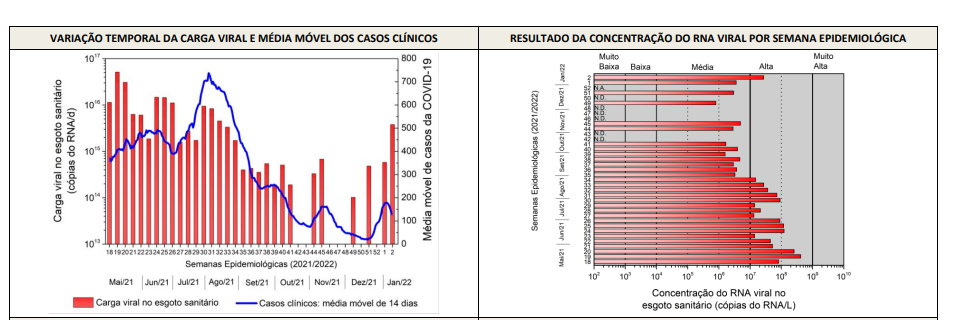Porém, a partir da semana do Natal, as taxas apresentaram tendência de mudança. De acordo com os dados da Rede Vírus-MCTI, na primeira semana de janeiro houve constatação de aumento dos índices, apesar de não ter atingido média concentração do vírus da Covid. A segunda semana do ano, no entanto, apresentou alta concentração.
