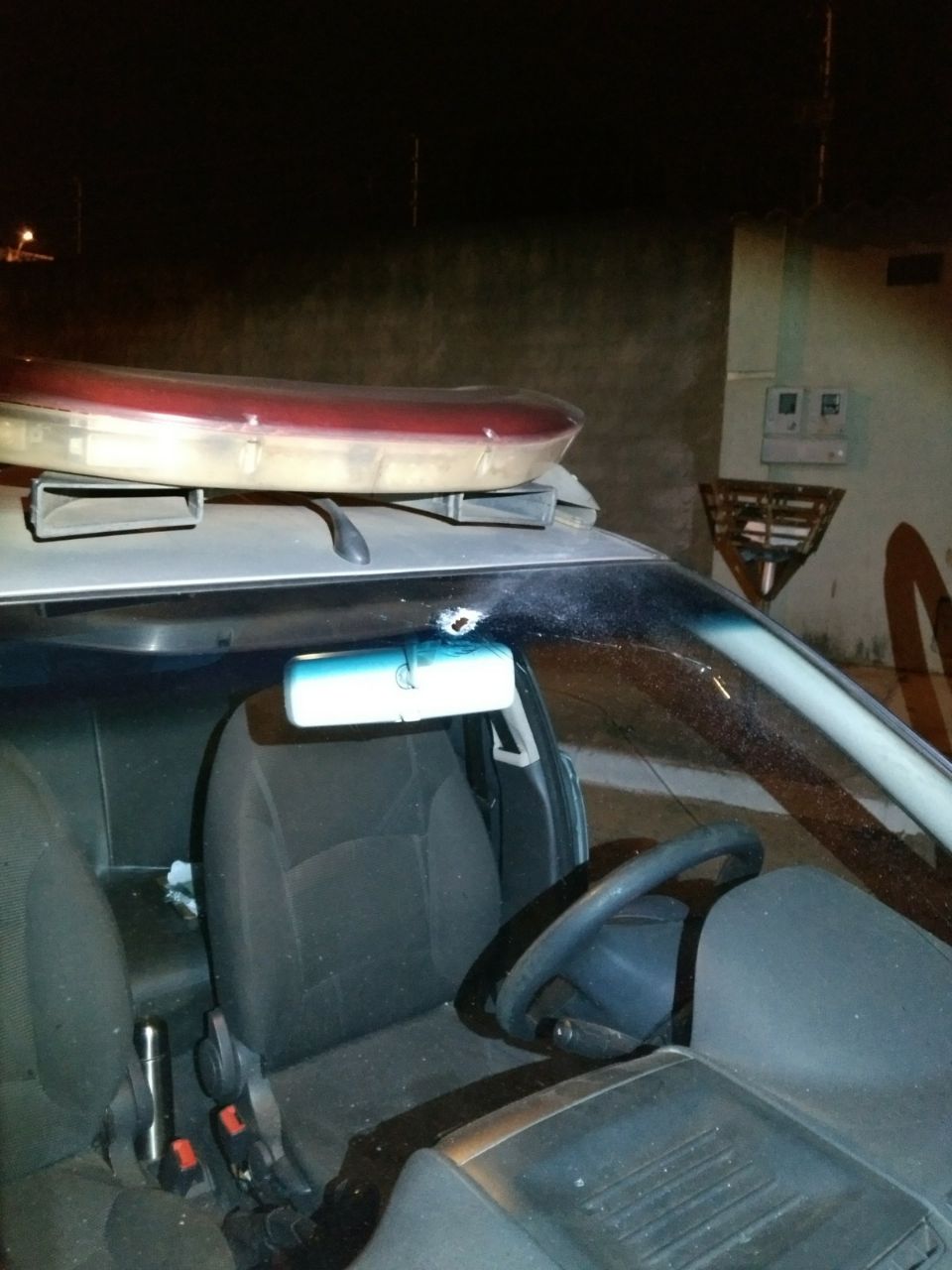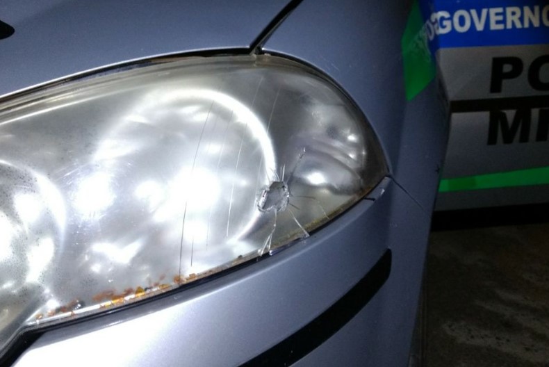 Um dos disparos atingiu o farol esquerdo de uma viatura. Nenhum policial ficou ferido (Foto: divulgação/PM)