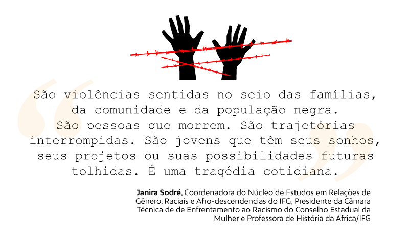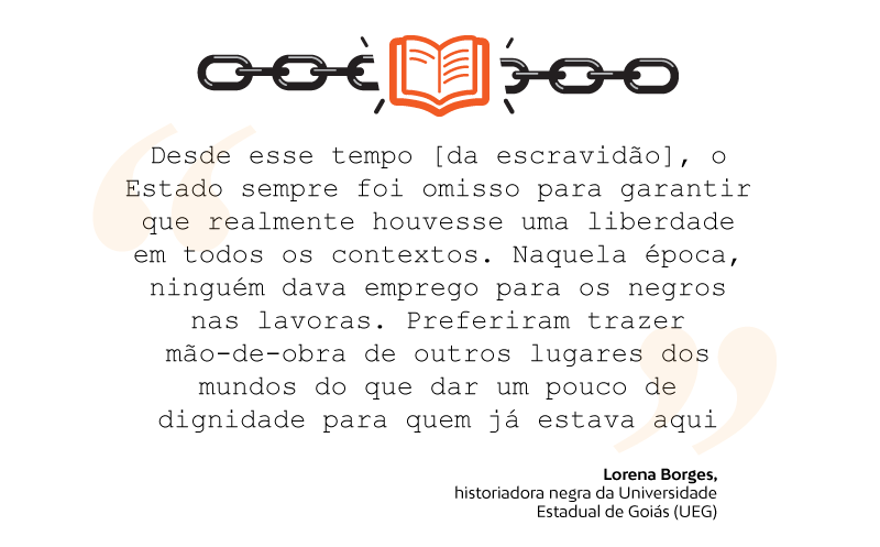 De acordo com a historiadora negra da Universidade Estadual de Goiás (UEG), Lorena Borges, a história do negro do Brasil caminha junto com a da violência. Problema, segundo ela, intensificado pela exposição diuturna dessas pessoas a condições sub-humanas de vida e trabalho. Desde a escravidão, esse cenário provoca a paulatina censura social a costumes, crenças, danças e demais formas de expressão da população negra.
