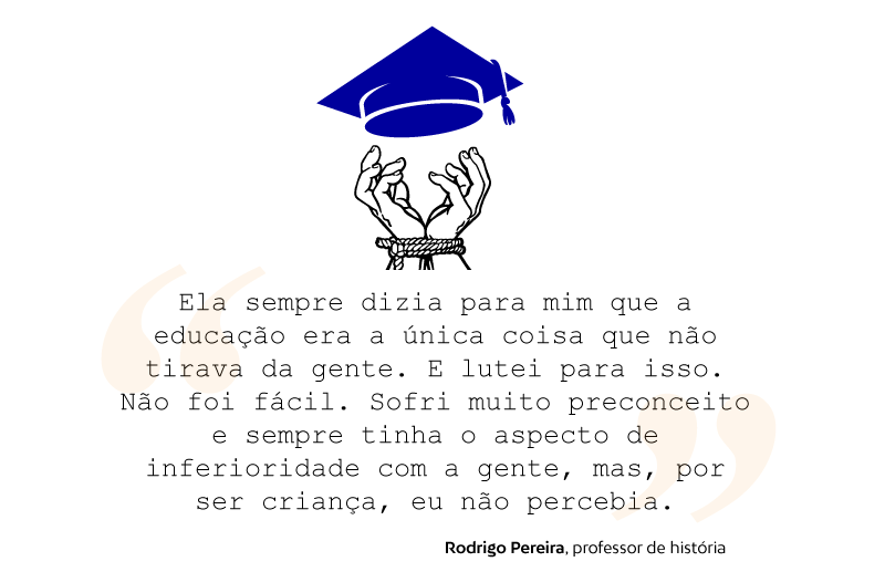 A mãe dele, Dona Abadia, de 55 anos, foi a principal responsável para que a história da família tomasse um rumo diferente. Apesar de todo apoio, Rodrigo afirma que o preconceito racial nunca foi situação isolada. “Ela [mãe] sempre dizia para mim que a educação era a única coisa que não tirava da gente. E lutei para isso. Não foi fácil. Sofri muito preconceito e sempre tinha o aspecto de inferioridade com a gente, mas, por ser criança, eu não percebia.”