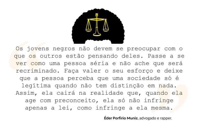 Sem rodeios, ele afirma que a advocacia e o rap são duas formas de praticar a liberdade de expressão. O estilo musical é o combustível diário para a vida de jurista. E vice-versa. “O jovem negro não deve se preocupar com o que os outros estão pensando dele. Passe a se ver como uma pessoa séria e não ache que será recriminado. Faça valer o seu esforço e deixe que a pessoa perceba que uma sociedade só é legítima quando não tem distinção em nada. Assim, ela cairá na realidade que, quando ela age com preconceito, ela só não infringe apenas a lei, como infringe a ela mesma”, finaliza.