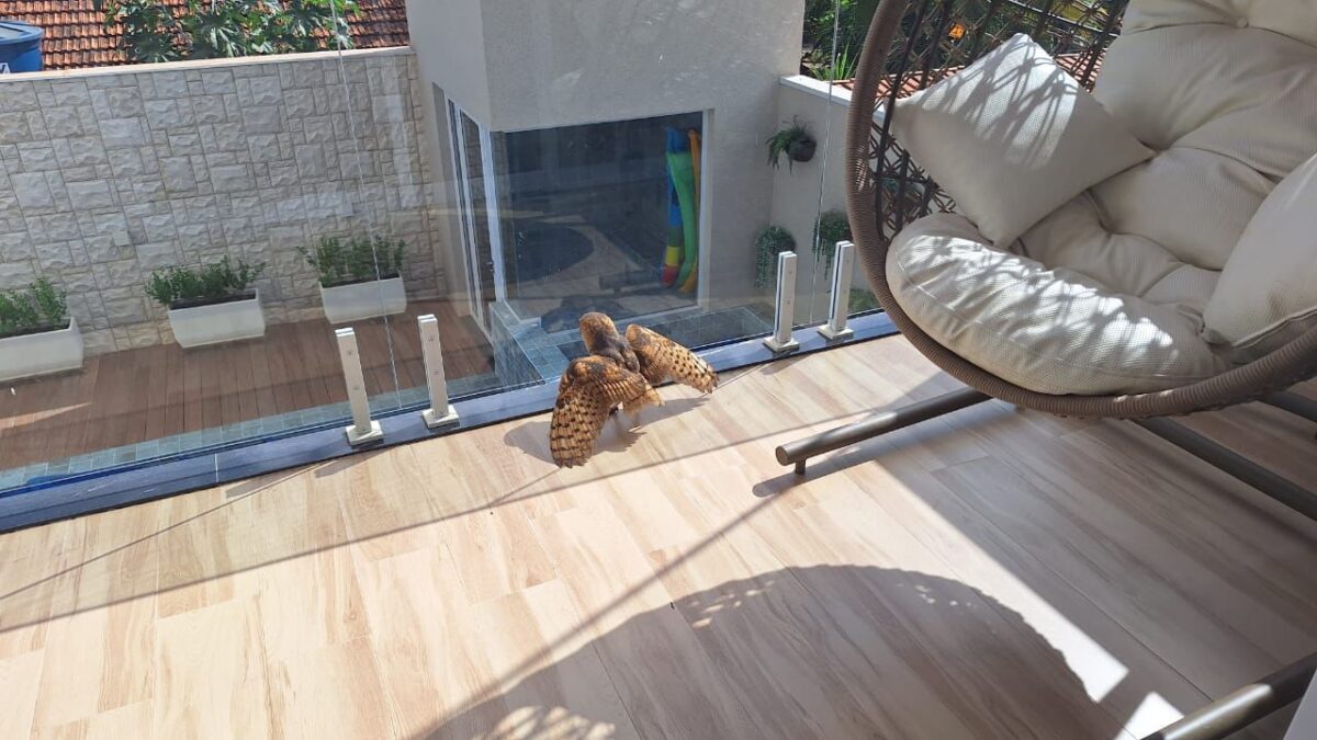Coruja é resgatada por bombeiro após ficar presa em sacada