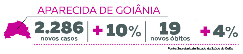 A cidade de Aparecida de Goiânia registrou o menor percentual entre as três maiores cidades de Goiás. Foram confirmados 2.623 novos casos em uma semana, o que representa um aumento de 10%. Na semana anterior, o crescimento foi de 9,6%. O número de mortes na cidade saiu de 414 para 433, um acréscimo de 4,6%. O aumento foi menor do que na semana passada (5,6%).