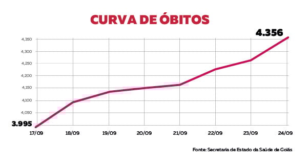 Nesta semana o número de mortes por Covid-19 subiu em um percentual maior do que o de casos confirmados. Foram registrados 541 óbitos no período e o total chegou a 4.356, o que representa um aumento de 13,5%. O resultado foi maior do que nas duas semanas anteriores, que registraram 10,1% entre os dias 10 e 17 de setembro e 8,4% entre os dias 3 e 10 de setembro.