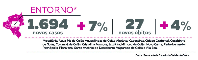 A região do Entorno de Brasília apresentou um percentual de crescimento abaixo da média estadual. Em uma semana, o número de casos de coronavírus saiu de 23.569 para 25.263, o que representa um aumento de 7,2%. O percentual apurado é menor do que o registrado na semana anterior, de 9,3%. Foram confirmadas também 27 mortes na semana, um crescimento 4,4%.