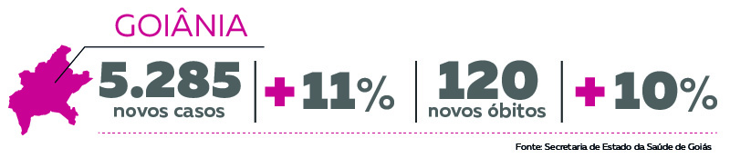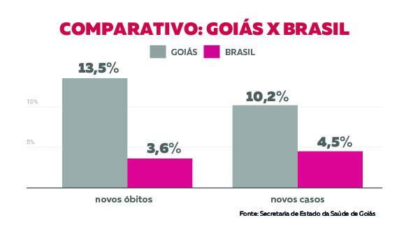 Os dados também mostram que tanto o número de casos quanto o de óbitos continuam crescendo acima da média nacional. Em todo o país, o número de casos confirmados de coronavírus subiu 4,5% no período, chegando a 4.657.702 infectados, de acordo com o Ministério da Saúde (MS). Já o número de vítimas fatais aumentou 3,6% e chegou a 139.808. Entretanto, a taxa de letalidade no estado de Goiás (2,2%) é menor do que a média brasileira (3%).