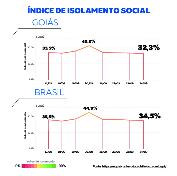 O índice de isolamento social em Goiás reduziu da semana passada para esta. O percentual saiu de 33,6% para 32,3%, de acordo com o monitoramento da empresa de georreferenciamento In Loco. O estado possui o segundo pior índice de isolamento social do país, perdendo apenas para o Tocantins 37,3%. A média nacional é de 43,7% e o recomendado pelas autoridades de saúde é de 70%.