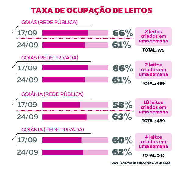 A taxa de ocupação dos leitos destinados ao tratamento de Covid-19 diminuiu no estado de modo geral, mas aumentou na capital. De acordo com dados da SES, no dia 17 de setembro, Goiás contava estava com 66,9% dos leitos ocupados. Este percentual caiu para 61,6% nesta quinta (24). Além disso, foram implantados 2 leitos no período. O total de leitos disponíveis é de 775.
