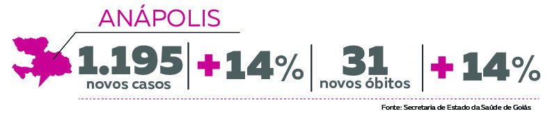 Entre as três maiores cidades do estado, Anápolis registrou o maior aumento. O número de casos de coronavírus na cidade saiu de 8.397 para 9.592, um crescimento de 14,2% no período. O percentual está acima da média estadual, mas foi menor do que o notado no período anterior (11,5%).