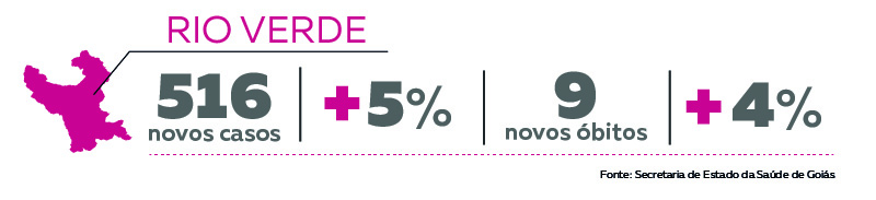 O município de Rio Verde, no Sudoeste do estado, tem o terceiro maior número de casos confirmados da doença. Até quinta (24), foram 10.719 registros de Covid-19 na cidade. Em uma semana, o crescimento foi de 5,1%. Este percentual foi menor do que o apurado na semana anterior, quando foi registrado um crescimento de 6,9%.