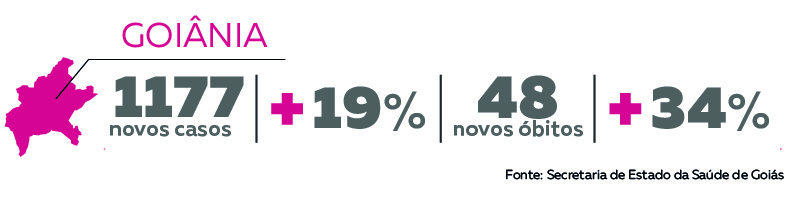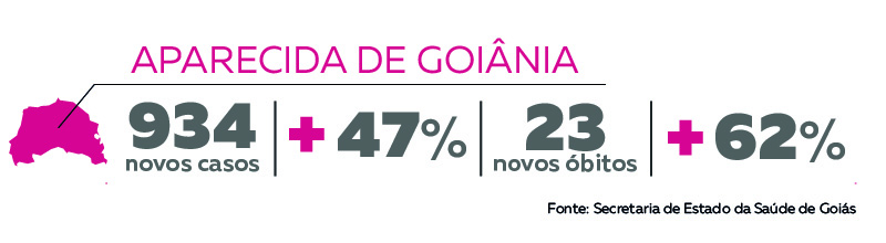 Em Aparecida de Goiânia foram confirmados 934 novos casos, um aumento de 47,33%. Na semana anterior, o crescimento foi de 57,58%. O aumento das mortes acompanhou a tendência estadual e foi superior ao de casos. No período apurado, o número de óbitos saiu de 37 para 60, um acréscimo de 62,16%.
