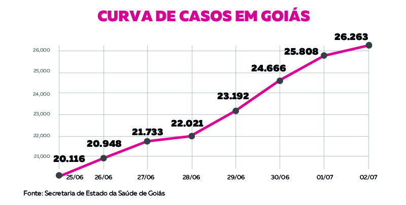 O Estado de Goiás registrou 6.147 casos de coronavírus em uma semana, de acordo com os dados fornecidos pela Secretaria de Estado de Saúde (SES)*. Nesta quinta-feira (2), foram anotadas 26.263 confirmações, contra 20.116 do dia 25 de junho. O aumento no período foi de 30,55%; no país, o índice foi de 21,88%.