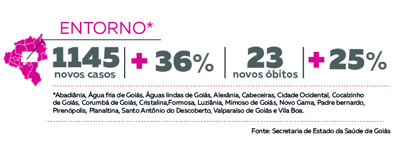 A região do Entorno de Brasília apresentou um percentual de crescimento acima da média estadual. Em uma semana foram registrados 1.145 novos casos, o que representa um aumento de 36%. O valor é menor do que o registrado na semana anterior, de 38,14%. Foram confirmadas também 23 mortes na semana, uma alta de 25,55%.