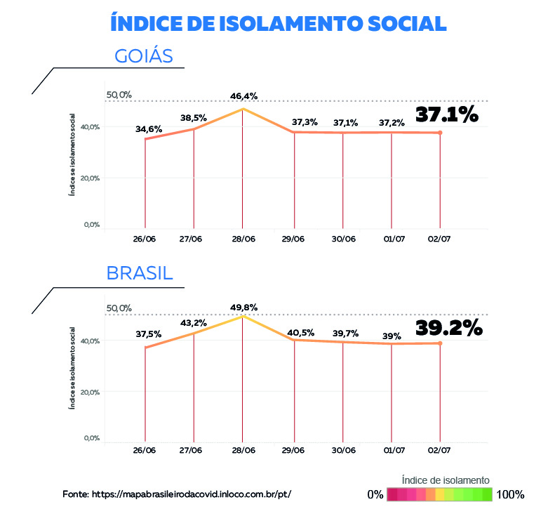 Depois de uma série de quedas, o índice de isolamento social em Goiás voltou a subir nessa semana, saindo de 35,2% para 37,1% , de acordo com o monitoramento da empresa de georreferenciamento In Loco. O estado possui o terceiro pior índice de isolamento social do país, perdendo apenas para Santa Catarina (37%) e para o estado do Tocantins (33,9%). A média nacional é de 39,2% e o recomendado pelas autoridades de saúde é de 70%.