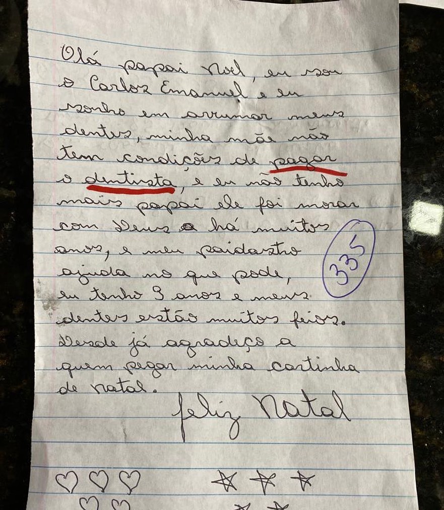 “Olá Papai Noel, eu sou o Carlos Emanuel e eu sonho em arrumar meus dentes. Minha mãe não tem condições de pagar o dentista e eu não tenho mais papai, ele foi morar com Deus há muitos anos e meu padrasto ajuda no que pode. Eu tenho 9 anos e meus dentes estão muito feios. Desde já agradeço a quem pegar minha cartinha de Natal”, diz a carta.