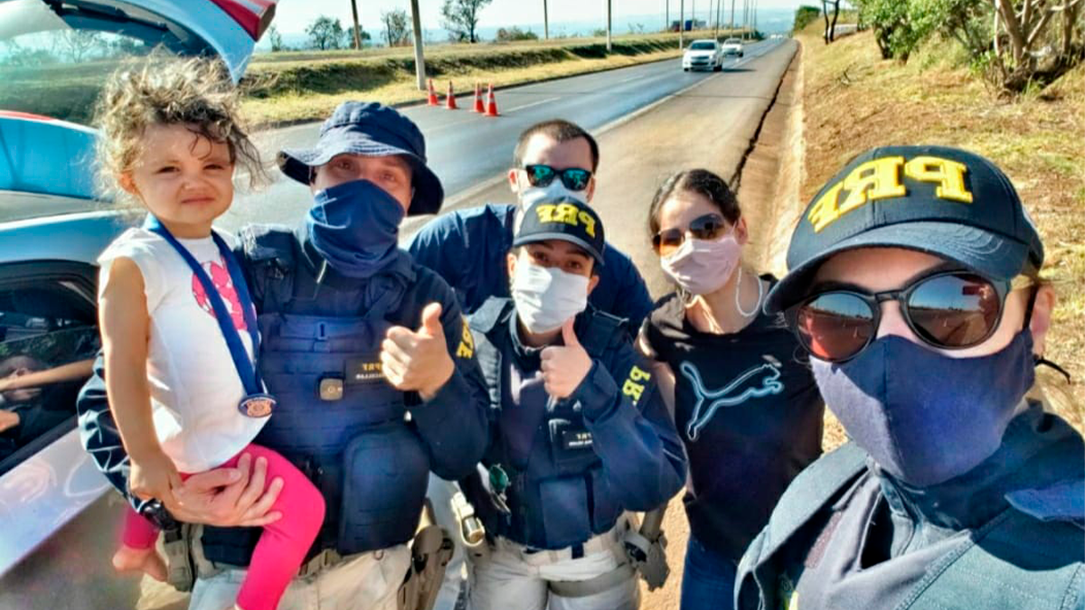 Depois do susto, a criança se acalmou e não precisou de outros cuidados médicos. Ela recebeu uma medalha de “amiga da PRF” e a família seguiu de férias.