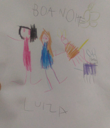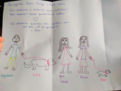 Em outra carta que Luíza, Laura e Maria Cecília receberam, os remetentes identificaram-se não só pelos nomes (Wagner, Ana Laura, Hellen e os cães Luma e Babi), mas também pelo desenho de cada um. “Nós recebemos e amamos suas cartinhas! Vocês deixaram nossa quarentena melhor”, diz a mensagem.