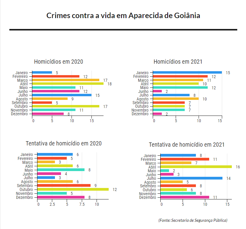 O número de crimes ligados à vida em Aparecida de Goiânia registrou uma leve queda entre os anos de 2020 e 2021. No total, houve 217 crimes violentos em todo o ano passado no município da Região Metropolitana, enquanto no ano anterior houve 211. Os dados são da Secretaria de Segurança Pública e foram obtidos através da Lei de Acesso à Informação (LAI).