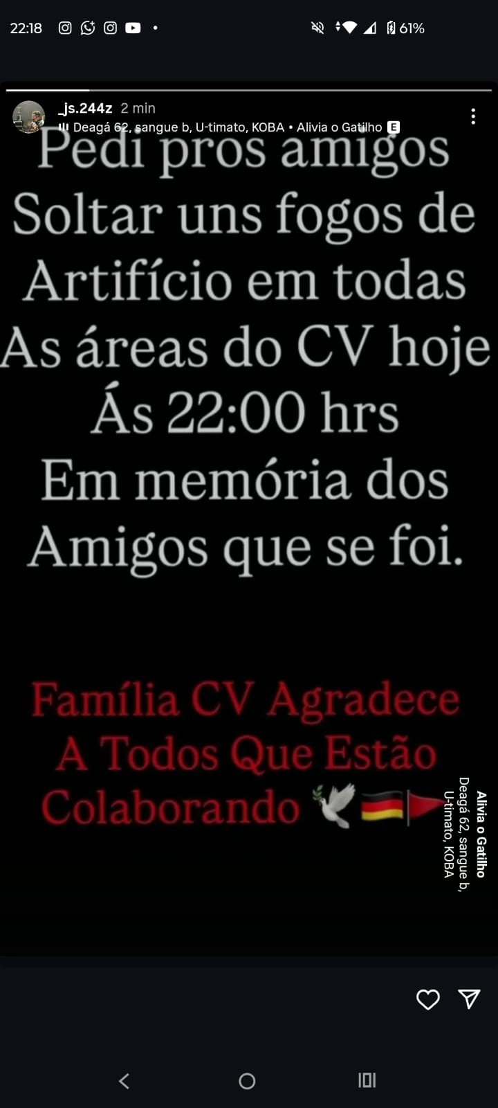 Mensagens espalhadas em grupos de WhatsApp mostram que o foguetório registrado no final da noite de terça-feira (4/11) em cidades da região metropolitana de Goiânia pode ter relação com o crime organizado. O ato teria sido determinado para homenagear seis foragidos de Goiás que morreram em operação contra o Comando Vermelho no Rio de Janeiro na semana passada.